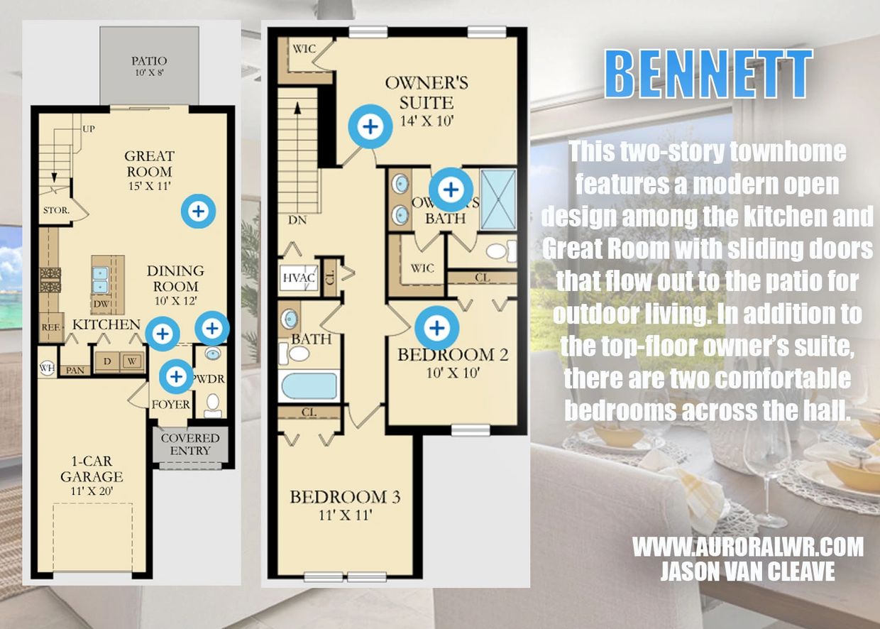 This two-story townhome features an open layout among the kitchen, dining room and Great Room with sliding doors that extend to the outdoor patio. On the second floor are all three bedrooms, including the owner’s suite with a private bathroom.